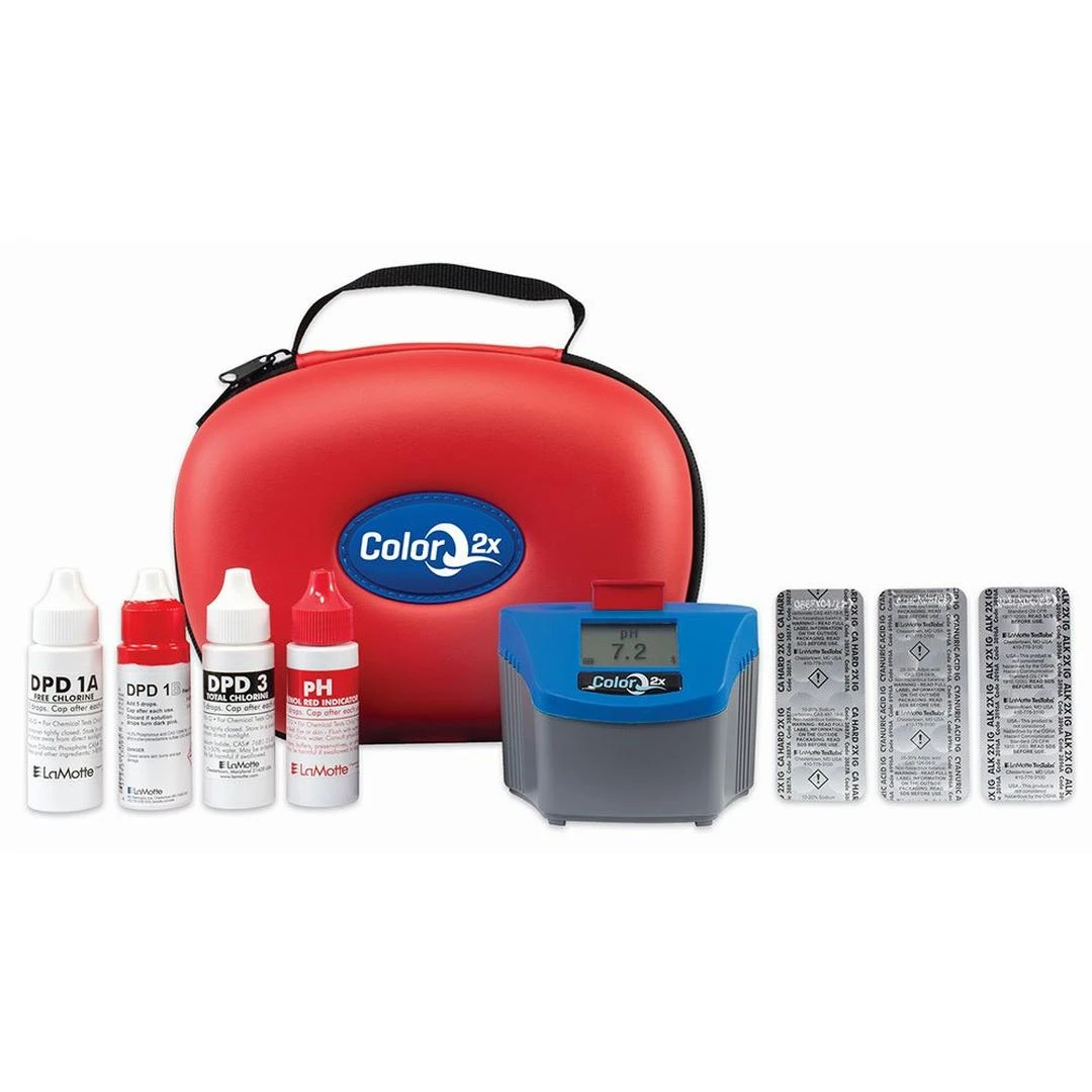 The Waterproof Bluetooth ColorQ 2x PRO 7 handheld pool and spa professional photometer directly measures Free Chlorine (DPD), Total Chlorine (DPD), Bromine (DPD), pH, Alkalinity, Calcium Hardness and Cyanuric Acid (Stabilizer) directly on a digital display. The handheld meter is easy to use and features economical liquid reagents that measure 144 tests per test factor for Free Chlorine, Total Chlorine (Bromine) and pH. The Alkalinity, Calcium Hardness and Cyanuric Acid tests are measured by using the TesTabs tablet method and includes 100 tablets for each test. The ColorQ 2x eliminates the need to visually determine slight color variations, thus taking the guesswork out of poolside water analysis. The photometer, testing reagents and photo-diagrammatic trilingual instructions (English, Spanish, French) are packaged in a convenient carrying case for on-site testing.