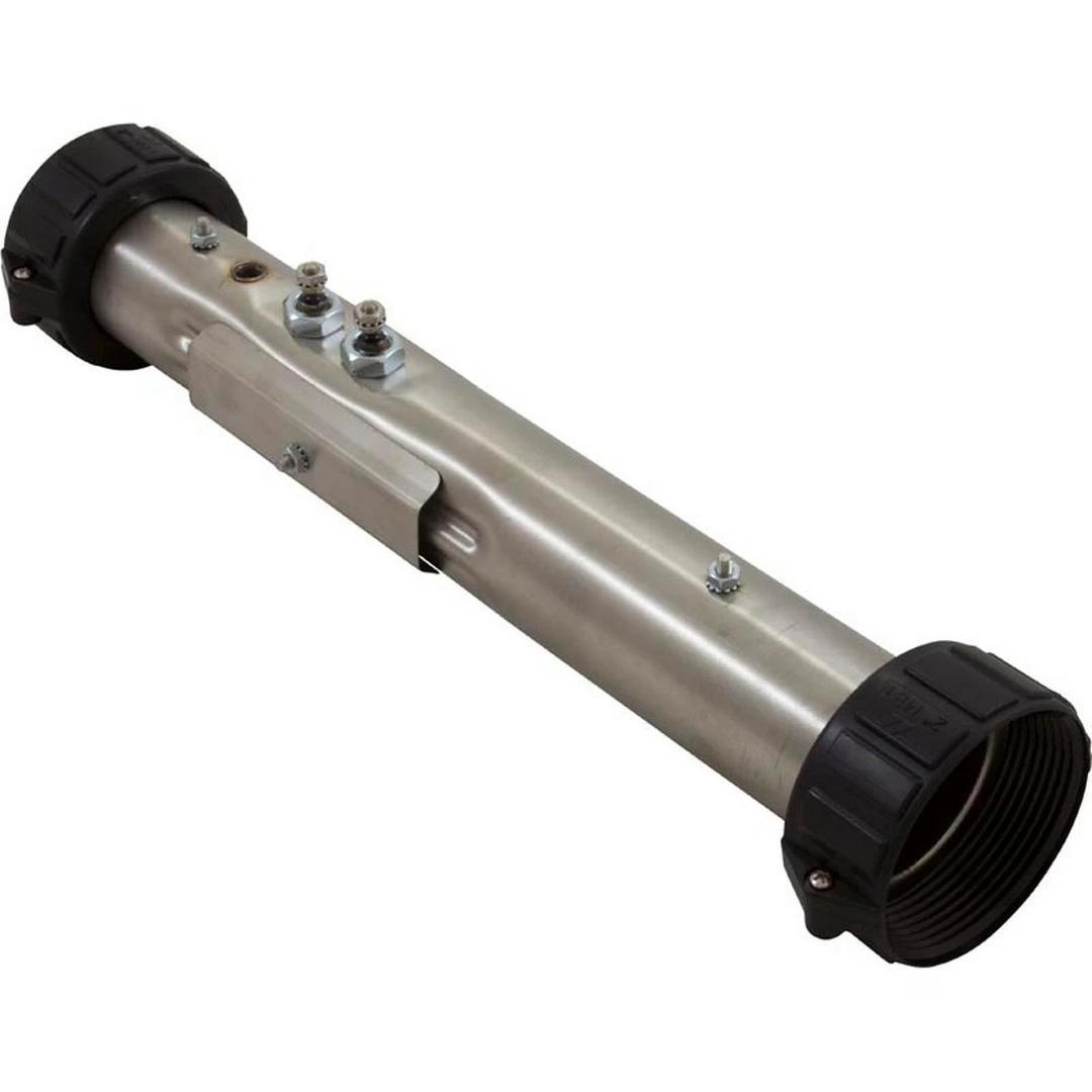 Flo-Thru spa heater replacement B24055R is a generic 15″”, 5.5 kW, 240V, used on Len Gordon, Spa Builders, and Pinnacle Universal and PCU spa packs. Flow Thru spa heater by Spa Components, B24055-Q, labeled as Heater Current Collector Assembly, includes Incoloy coated heater element, unions not included.